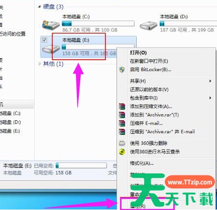 以e盘为例。打开“计算机”,并点击“e盘”右击“属性”。