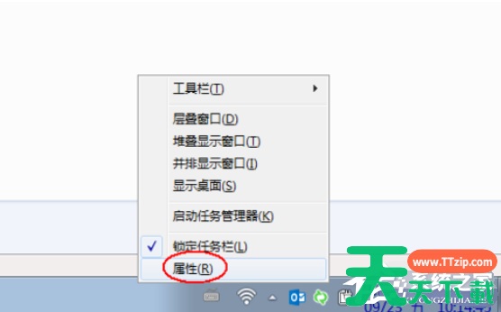 1、如果音量图标不见,则右击任务栏空白地方,选择“属性”。