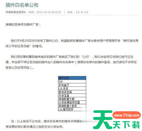 目前,LOL官方网站已公布了“白名单插件”,对于其它“黑名单”插件可以存在修改游戏后台数据、代码(例如更新皮肤、无限视距)等操作,从而导致LOL游戏过程中无故出现崩溃现象。