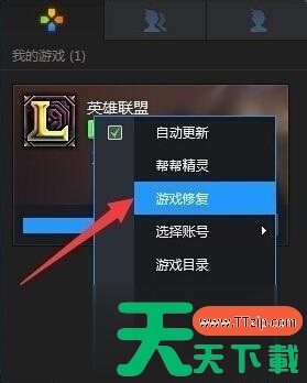 1、在“LOL助手”(TGP)游戏界面中,点击LOL图标右上角的下拉列表,从中选择“游戏修复”项;