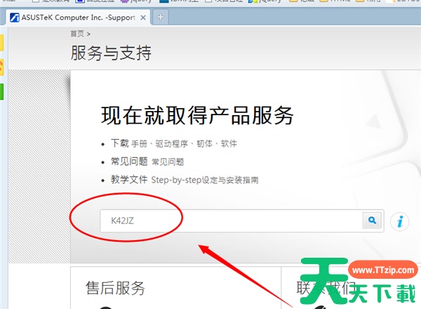 进入该款笔记本型号官网,点击【服务与支持 】菜单,搜索笔记本相应的型号,如K42JZ。