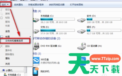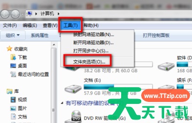 2、因为需要删除的右键菜单内容在系统盘隐藏文件夹,所以我们需要设置显示隐藏文件夹,接下来我们在上方找到工具——文件夹选项(或者直接点击左上方的组织——文件夹和搜索选项)。