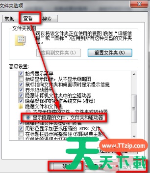 3、进入文件夹选项后,弹出下面窗口,查看——选择显示隐藏文件、文件夹和驱动器——应用——确定。