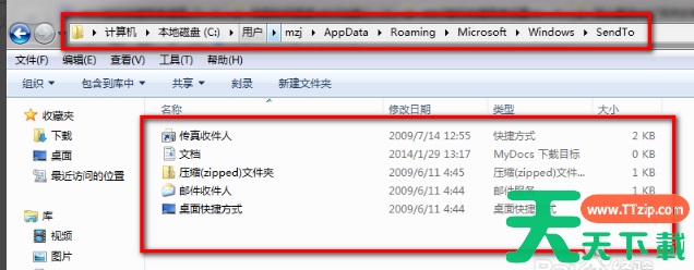 4、接下来我们就需要进入系统盘了,依次打开C:\用户(Users)\用户名(我的是mzj)\AppData\Roaming\Microsoft\Windows\SendTo,SendTo文件夹里面就是右件菜单中发送到的操作选项,在这里可以选择性的删除某些不用菜单!