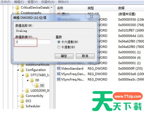 3、右键打开scaling 把数值数据修改为3,点击确定退出注册表编辑器即可。