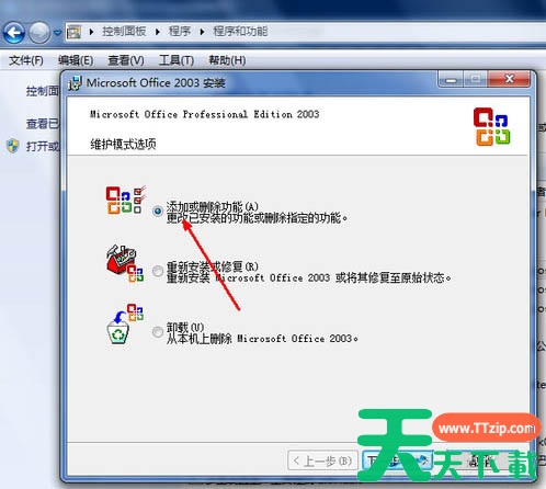 4、选择后就会自动出现office的修复程序,在此提供了两个修复选项,一个为添加或者删除,另一个为重新安装或修复。若你的excel只是一个快捷方式,却打不开,很可能是当初安装时只预留了一个快捷方式,所以可选第一项,若是以前安装了打不开就要选第二项修复。