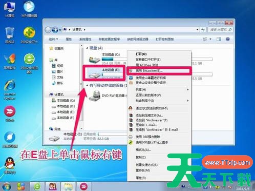 2、如想要给E盘进行加密。在E盘上单击鼠标右键后选启用Bitlocker;