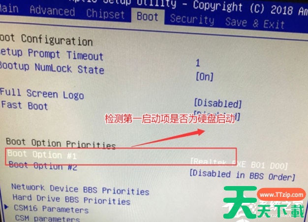 2、在Bios中检查第一启动项是否正确。一般在 Boot 选项中,找到第一启动项,默认是否选择为您的硬盘。