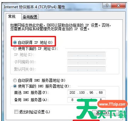 2、再打开“internet协议版本 4(TCP/IPv4)”属性,在打开的窗口中勾选“自动获取IP地址”,并点击“确定”按钮。DNS可以修改,首选114.114.114.144,备用:8.8.8.8。并重启启用本地连接来尝试解决问题。