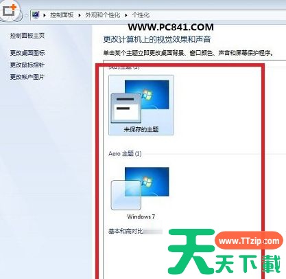 2、进入个性化设置后,我们即可进行更改Win7配置方案了,最简单的方法是,我们更换下主题,即可自动变换配色方案。