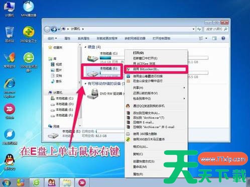 2、例如想要给电脑的E盘进行加密设置密码。我们在E盘上鼠标右键点击,选择“启用Bitlocker”。如下图所示: