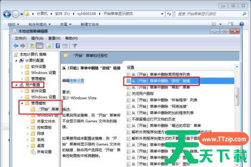 3、执行gpedit.msc程序就打开本地组策略编辑器,如下图所示,在左边本地计算机策略下面的列表中按照如下图红色方框所示,打开开始菜单和任务栏设置项,之后在右边的设置菜单列表中找到“从开始菜单中删除游戏链接”,然后在上面双击鼠标打开该功能的编辑设置对话框;