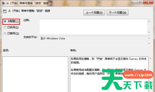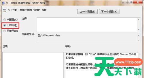 4、在“从开始菜单中删除游戏链接”对话框的左上角,可以看到该功能的开关是打开的,所以在开始菜单中就不显示游戏了;