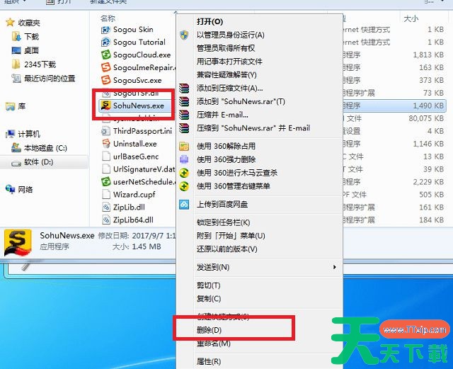 3、打开“SogouInput”文件夹,可以看到一个纯数字文件夹,这个是搜狗的版本号,点击进入,然后找到搜狐新闻的exe程序,右键打开菜单,选择删除即可。