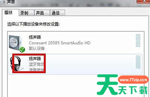 7、此时的默认播放设备是内置的扬声器,必须把蓝牙音频作为默认播放设备,才能使用蓝牙耳机听音乐 ,设置完成后,就可用蓝牙耳机听电脑播放的音乐了。