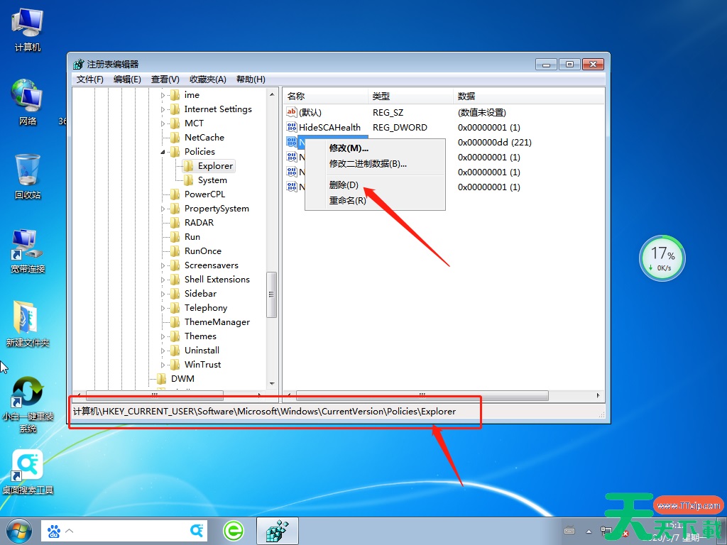 3、然后依照图中路径找到:Explorer文件夹,然后右击“NoViewContextMenu”注册表,点击删除,然后重启计算机即可。