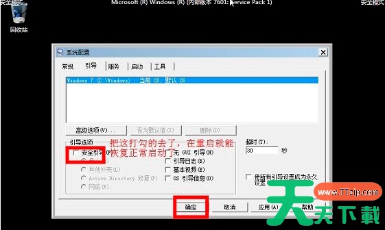3、点击确定后,重启系统就会自动进去安全模式了,如果要退出安全模式的话,按如上步骤,将安全引导的勾选取消即可。