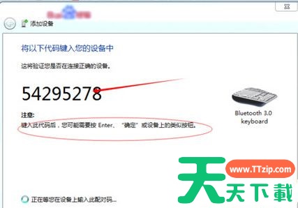 4、这时系统会提示你在键盘端输入配对密码实现配对,把他提示的数字在键盘上打一遍然后按回车键;
