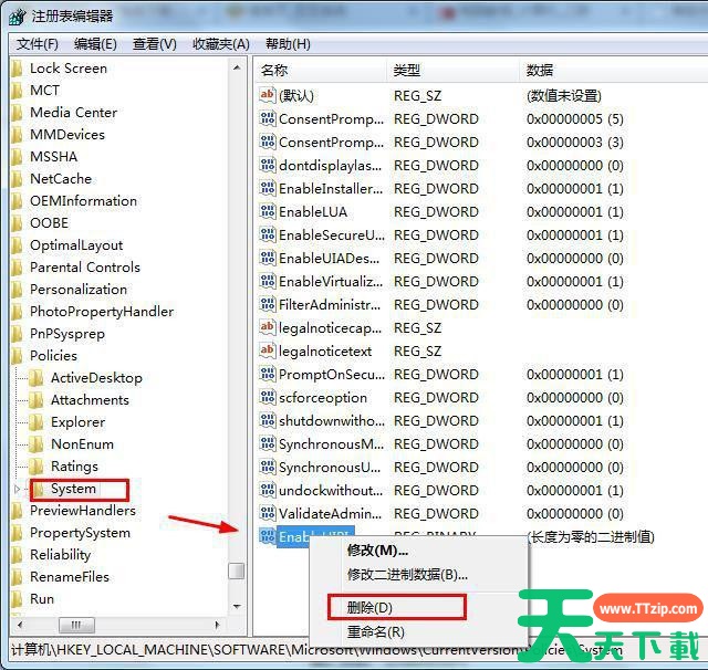 3、在右侧窗口中找到并右键“EnableUIPI”,选择“删除”。