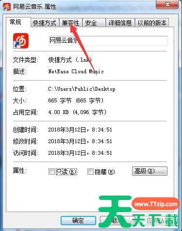 2、在弹出的属性窗口切换到兼容性选项卡。