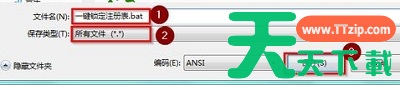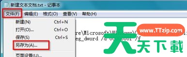 3.复制完成之后,咱们点击窗口上方的文件-另存为,然后将该文件另存为.bat格式的文件,例如天天下载Ttzip这里命名为一键锁定注册表.bat,在保存类型这里,咱们需要设置为所有文件,如下图中所示,设置完成之后,咱们直接点击确定保存即可。