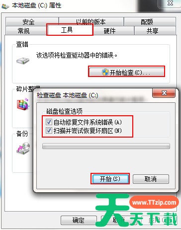3、除此之外,检查磁盘驱动器是否存在错误也是有必要的,以系统盘为例,右键点击系统盘,选择属性,然后切换到工具一栏,点击开始检查,在弹出来的窗口中将磁盘检查选项下的两个选项都勾选上,然后点击开始,如下图所示: