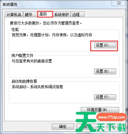 2、在系统属性窗口的“高级”选项卡下,点击“性能”中的“设置”。