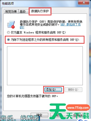3、在性能选项窗口中,点击“数据执行保护”标签,选择“为除下列选定程序之外的所有程序和服务启用DEP”选项,再点击“添加”按钮。