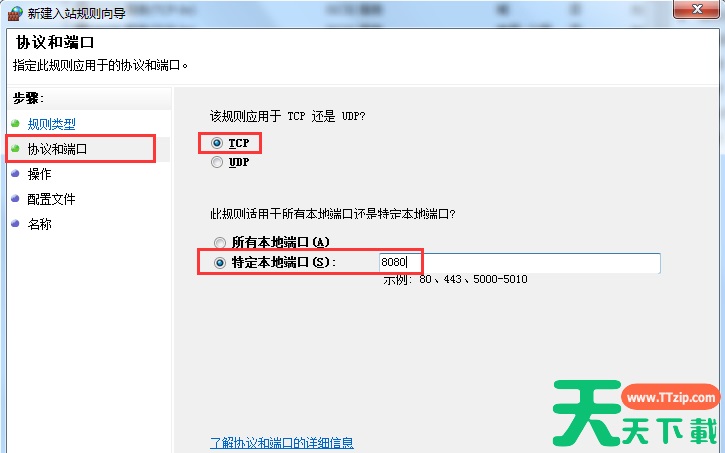 第五步:此时设置“协议和端口”,例如我们设置为TCP协议,端口为8080;