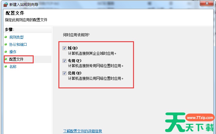 第六步:“允许链接”后点击“下一步”,勾选“域”、“专用”以及“公用”前面的框,再点击“下一步”,最后输入其名称。