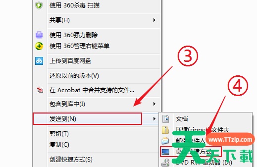 2、然后鼠标右击需要隐藏的文件夹发送到【桌面快捷方式】。