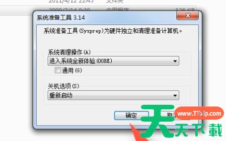 3、出现系统准备工具,在系统清理操作中选择【进入系统全新体验(OOBE)】,然后点击【确定】。
