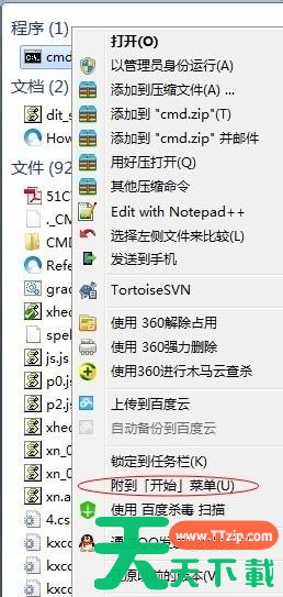 4、在弹出菜单中选择“附到『开始』菜单”(“Pin to Start Menu”),这样,该快捷方式便出现在开始菜单上;