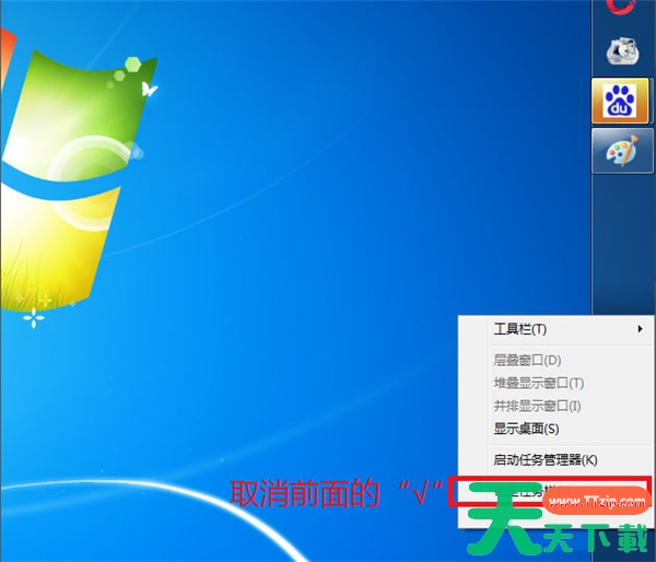 1、首先用鼠标右键点击工具栏的空白处,若锁定任务栏前面以打勾,则点击锁定任务栏把勾去掉;
