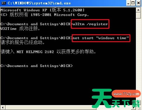 2、在提示w32Time成功注册后,再输入net startwindows time,回车,之后就会提示服务启动成功。