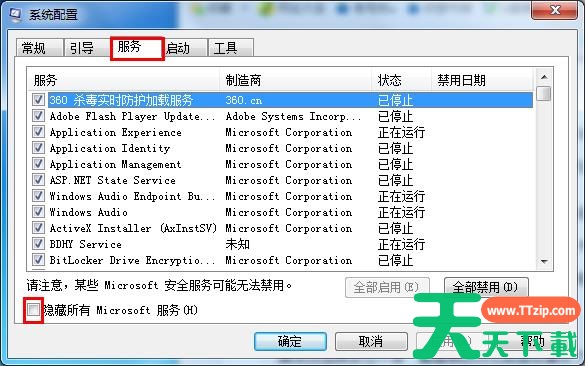 2、接着在弹出的系统配置框中点击“服务”栏,勾选左下角的“隐藏所有Microsoft服务”,并将列表中还存在的所有服务禁用,确定后重启电脑。