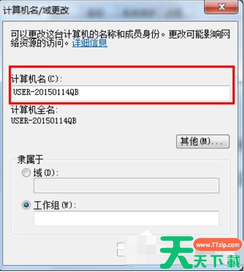 4、点击【更改】弹出窗口,找到【计算机名】并填写。