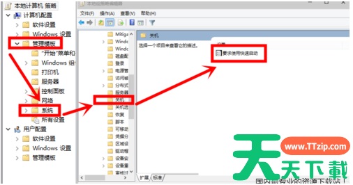 2、在窗口中依次打开计算机管理【管理模板】【系统】【关机】,然后点击打开右侧的【要求使用快速启动】。