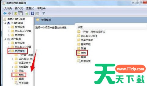 2、之后会打开本地组策略编辑器,依次选择【用户配置】-【管理模版】-【系统】;