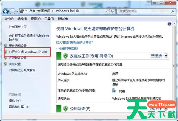 4、在窗口中,分别点击【家庭或工作(专用)网络位置设置】和【公用网络位置设置】里的“启用Windows防火墙”。