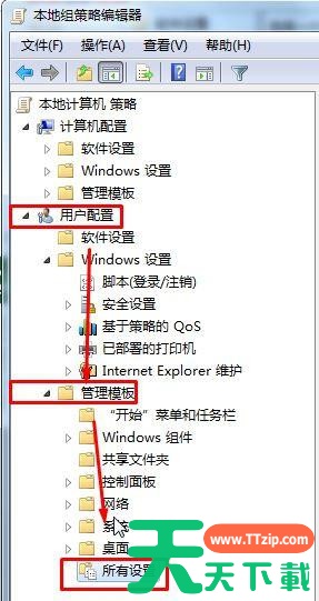 2、在组策略左侧依次展开:【用户配置】—【管理模板】—【所有设置】;
