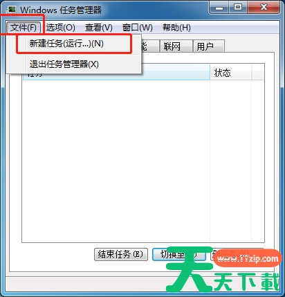4、在任务管理器中单击【文件】选择【新建任务】;