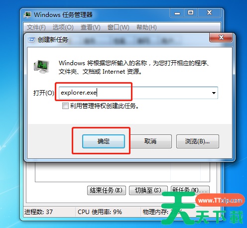 5、在弹出框输入“explorer.exe”,然后单击【确定】,稍等片刻,电脑桌面就能恢复了。