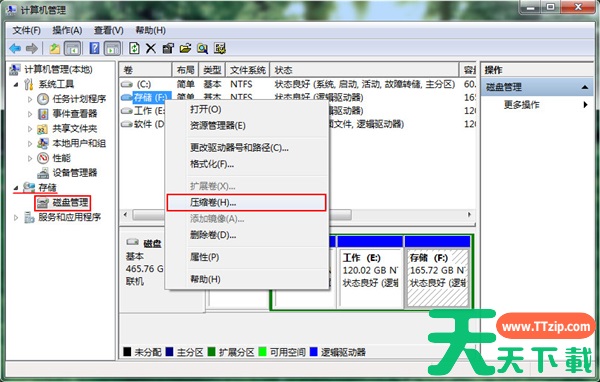 2、进入计算机管理界面,单击“存储-磁盘管理”选项,然后右键单击需要压缩的其他磁盘,选择压缩卷以执行操作,如图所示: