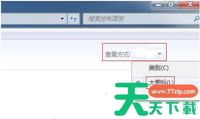 2、进入控制面板界面,点击查看方式下拉框选择大图标进入。