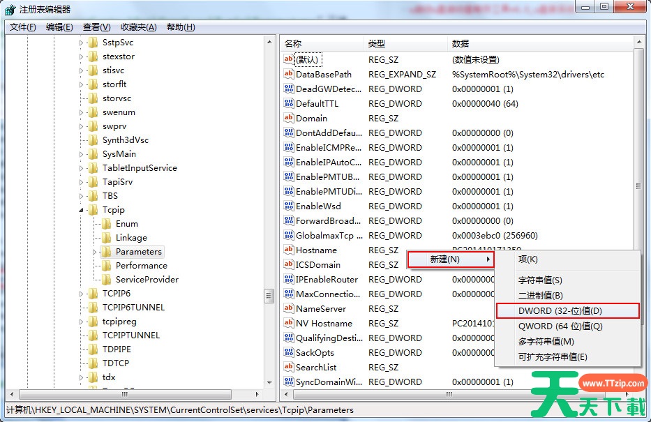 3、打开注册表编辑器后,依次展开“HKEY_LOCAL_MACHINE\System\CurrenControlSet\Services\Tcpip\Parameters”文件夹,找到GlobalmaxTcp WindowSize键值,没有该键值右键点击空白处选择“新建--DWORD(32位)值”,如下图所示: