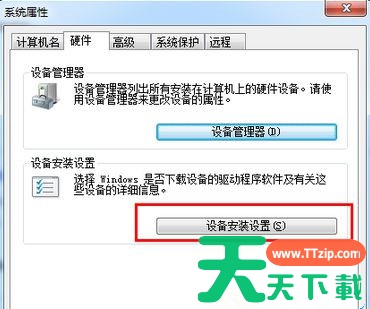 2、在打开系统属性点击“硬件”面板之后找到里面的“设备安装设置”点击它进入。