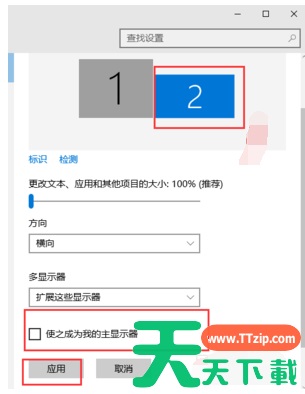 3、选择你需要当主显示器的那个图标,勾选使之成为我的主显示器,点击应用,这样这个显示器就成为了你的主显示器了。