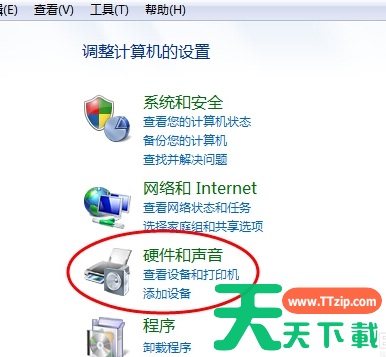 2、在弹出的对话框里点击【硬件和声音】选项进入下级页面。