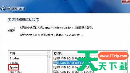 5、在左侧厂商框中选择对应的品牌(这里天天下载Ttzip的是Epson),然后在右侧选择对应的打印机型号,点击下一步即可;